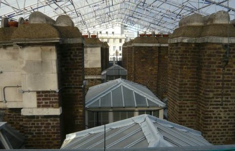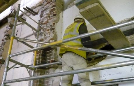 New attenuator openings were formed on levels 1 and Lower Ground Floor along with new door openings with R6 lintels, new risers and installation of approximately 200 padstones to support new steelwork. The works included controlled removal of the lead-contaminated plasterwork from the mansard walls on level 3.